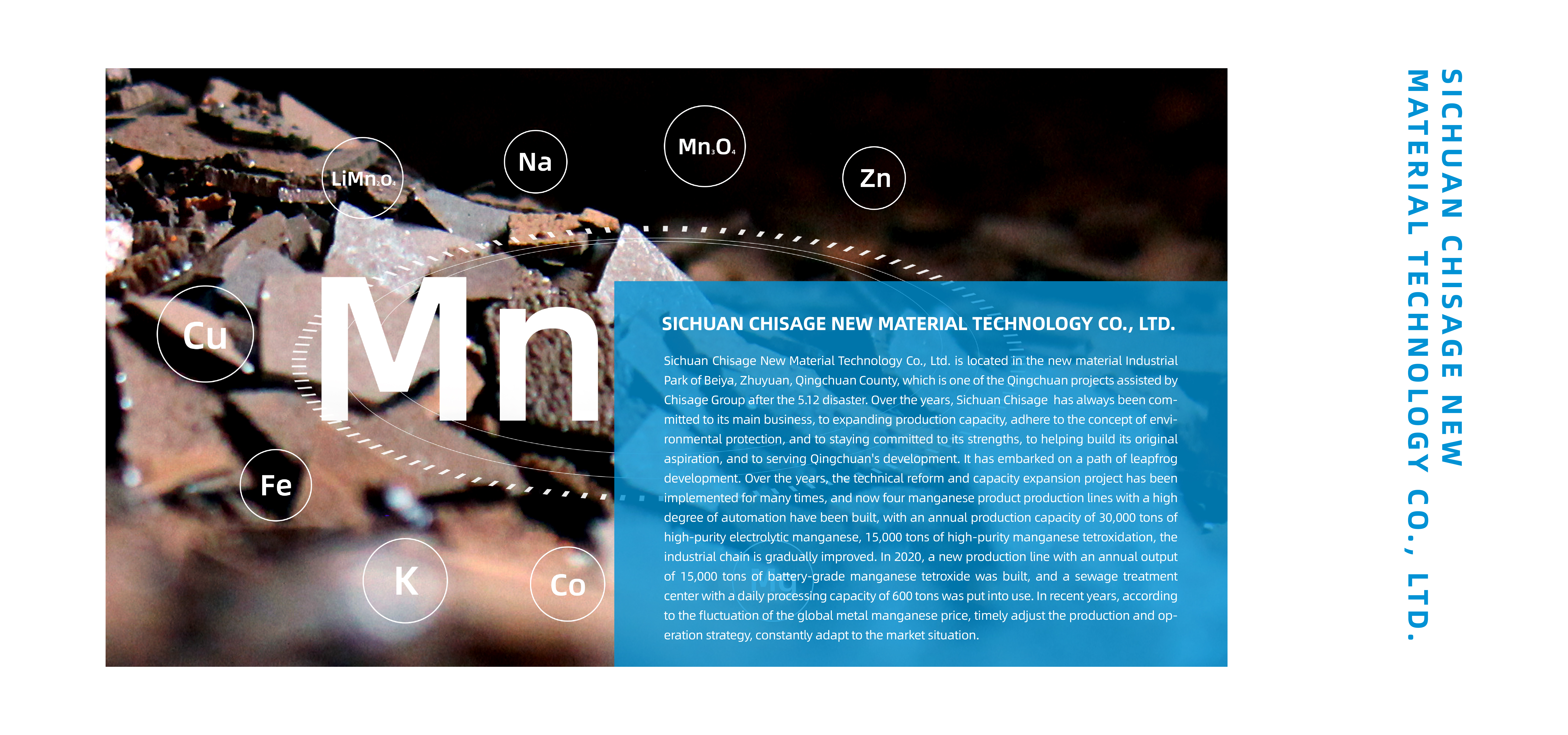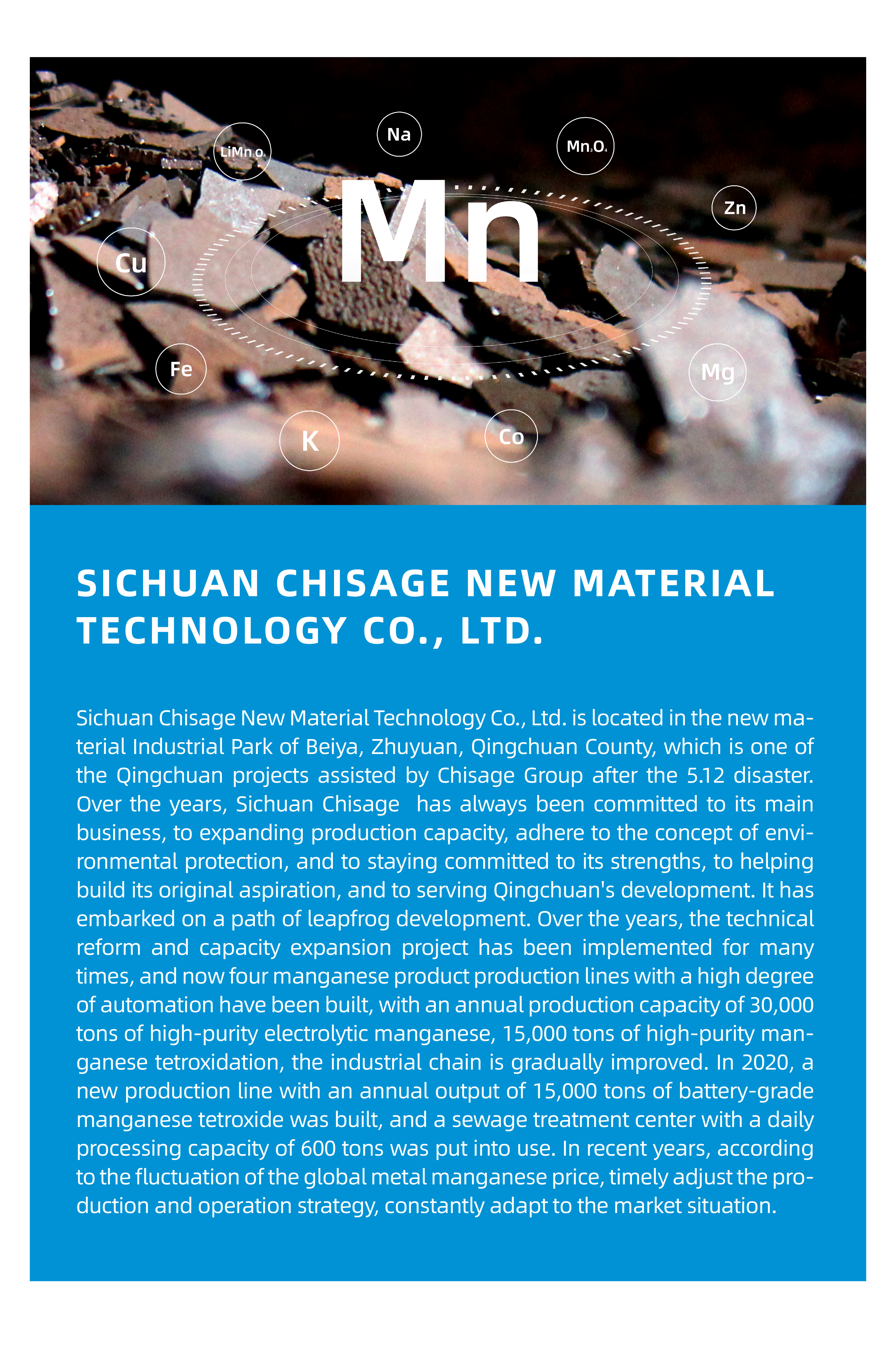 The company is mainly engaged in the research, development, production and sales of manganese-based materials such as high-purity electrolytic manganese, electronic-grade manganese tetraoxide, and battery-grade manganese tetraoxide.