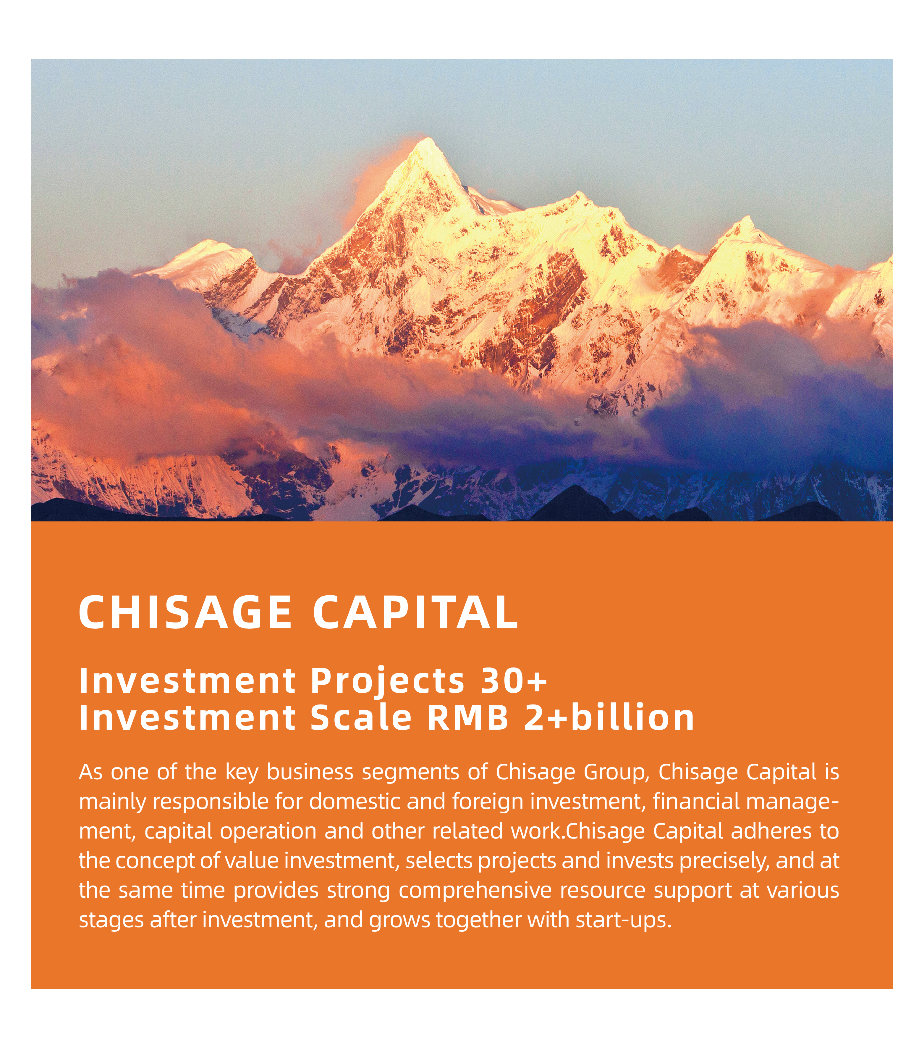 As one of the key business segments of Chisage Group, Chisage Capital is mainly responsible for domestic and foreign investment, financial management, capital operation and other related work.Chisage Capital adheres to the concept of value investment, selects projects and invests precisely, and at the same time provides strong comprehensive resource support at various stages after investment, and grows together with start-ups.