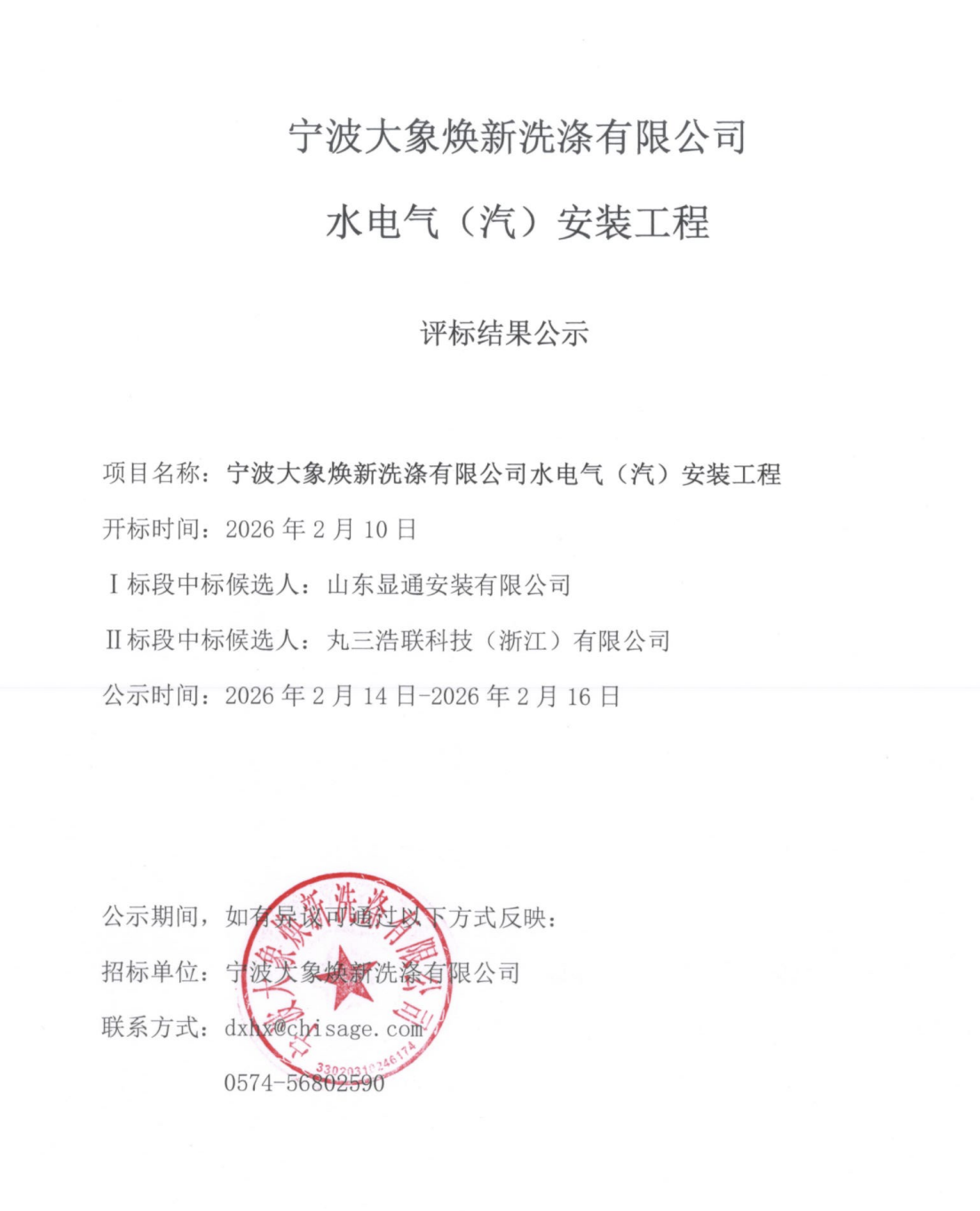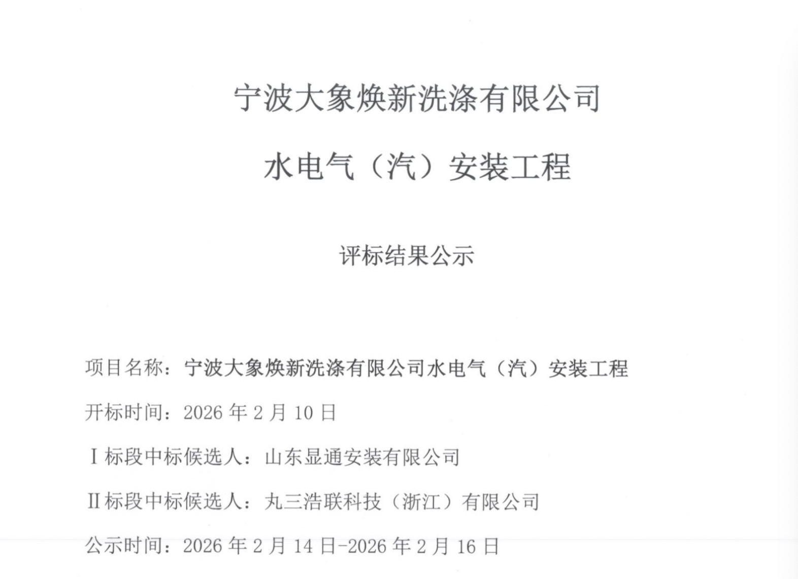 宁波大象焕新洗涤有限公司水电气(汽)安装工程评标结果公示文件